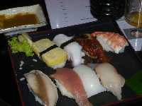A un moment, elle est dehors, assise à une table à droite du bar. Elle a déjà tout analysé, elle essaie de me changer les idées, elle me montre la vitrine du resto japonais à coté. Je lui demande si elle aime ça, elle dit oui (moi je supporte pas ces bouts de poisson crus...). Je lui en propose, elle me montre un truc grillé dans une assiette. Je vais dans le resto, encore un truc bizarre, on croirait changer de pays et arriver au Japon. La déco, les vieux japonais assis en tailleur en train de manger, la serveuse en costume traditionnel... Je demande le prix du truc grillé, puis de l'assiette entière (quelques euro, presque rien...), je demande à en avoir une, je paie, on me livre à coté, OK. Quand la fille amène l'assiette, Pam est vraiment contente (j'ai l'impression, en tout cas), par contre, le conflit arrive, parce que comme par hasard, le morceau qu'elle préfère, c'est aussi celui que François préfère... Bah, ils ont qu'à le mâcher 5 secondes chacun, c'est ça un vrai couple....