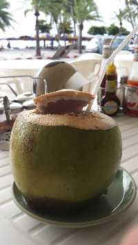 Bref, je finis dans un resto/bar qui fait l’angle de la rue, vue sur la Beach, je me cale et sirote une noix de coco :
