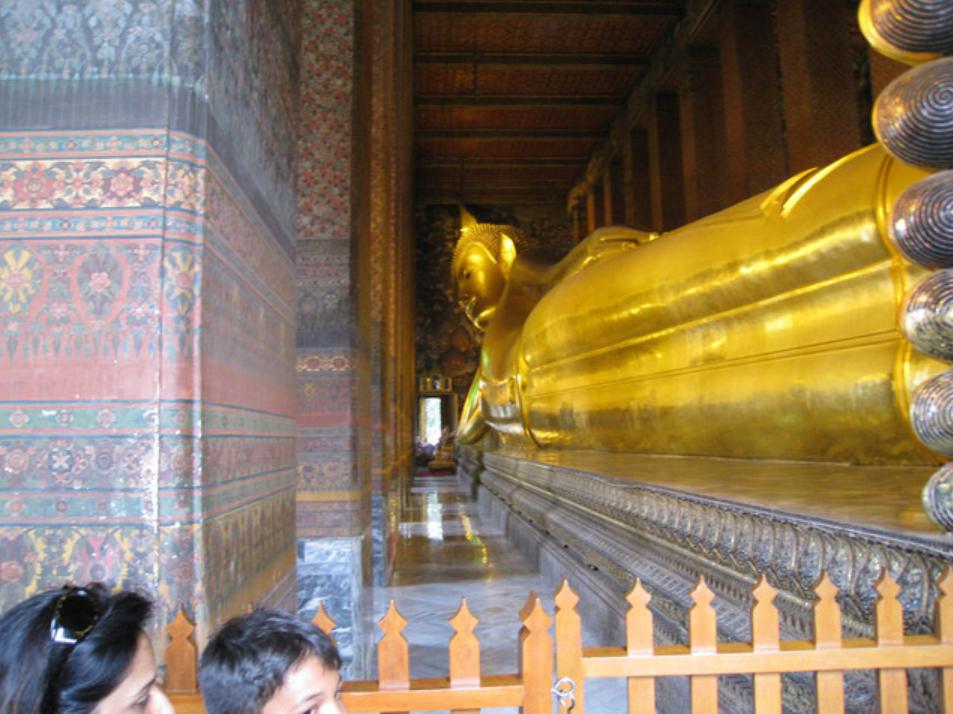 Nous quittons les chambres en début d'après midi afin de visiter les monuments au plus vite, ceux-ci fermant relativement tôt, vers 17-18h. Arrivés en taxi au " Wat Pha Kae ", l'ancien palais de l'empereur, célèbre pour son Bouddha d'Émeraude, nous apprenons qu'il ferme exceptionnellement à 15h, ce qui nous empêche de le visiter. Un arnaqueur comme il en pleut sur ces lieux touristiques nous oriente vers un taxi-tricycle (appelons cela un tuk-tuk) qui nous emmène voir le Bouddha debout, une vrai merde d'un kitch gerbant. Nous décidons alors de faire confiance au guide " Lonely Planet " et demandons à aller voir le Bouddha couché au " Wat Pho ". A ce moment le chauffeur de ce même tuk-tuk, qui nous avait attendu nous parle de son agence touristique TAT qu'il aimerait nous montrer. Nous insistons pour aller au Wat Pho mais cette enflure nous amène tout de même à TAT, dans un tout autre quartier de la ville, nous faisant perdre un temps précieux. Nous l'engueulons et lui donnons son argent pour aller trouver un autre tuk-tuk apparemment plus sympathique puisqu'il ne nous saoule pas de paroles. Il nous amènera à bon port mais nous arnaque sur la somme. Il demande 200b alors que j'avais cru entendre 20b lorsqu'il nous a pris. Venant d'arriver en Thaïlande, on préfère ne pas discuter mais le taxi-meter nous aurait couté qu'une 50aine de bahts.