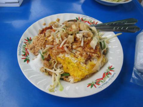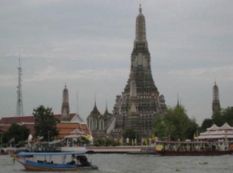 Les petits temples qui l'environnent sont très zens et reposants. Ensuite nous allons à pied vers le fleuve afin de visiter le " Wat Arun ", sorte de tour située sur l'autre rive. Nous traversons alors de sympathiques quartiers populaires et notons que l'on peut manger n' importe où. Il y a des vendeurs de brochettes tous les 10m. On s'arrête dans une gargote qui nous fait un plat de poulet-riz-légume excellent pour 80 centimes d'euro (40b) avec sauce épicée séparée, afin de ne pas se brûler la langue.