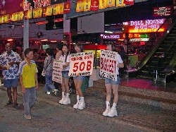 | ... mais certains Go-go bars présentent des jeunes femmes entièrement nues, souvent à l'étage, car la loi thaïlandaise interdit, normalement, de montrer un sexe au rez-de-chaussée. Aujourd'hui les militaires font la chasse à ces établissements et ils sont devenus rares.